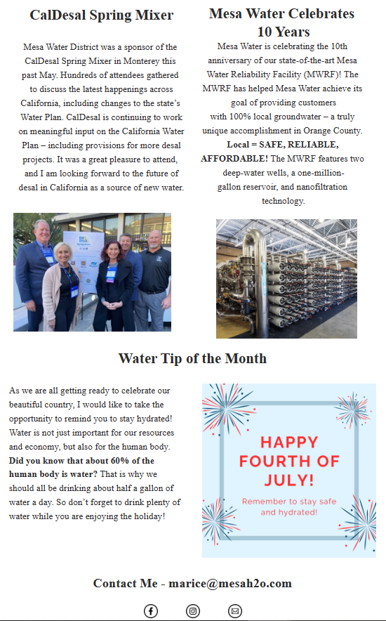 In 2022, Marice was appointed to serve a two-year term on the Association of California Water Agencies (ACWA) Region 10 Board, representing Orange County and San Diego members of ACWA, the country’s largest statewide coalition of public water agencies.